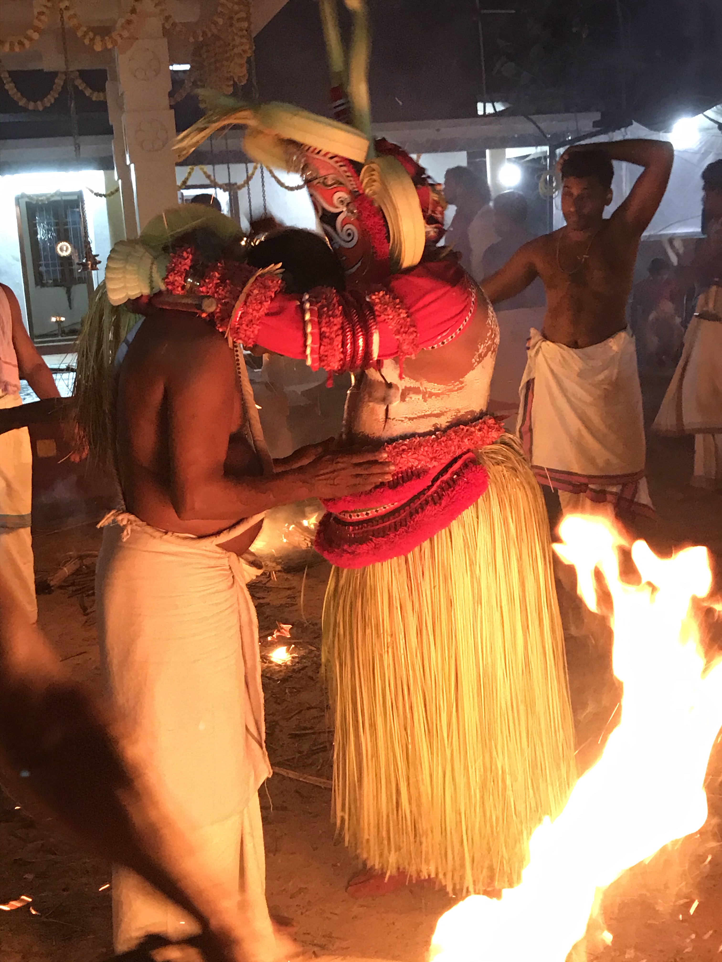 Each time Theyyam is performed, even if it is the same character, there is a sense of unpredictability. On this particular occasion it is both terrifying and playful. As the fiery Theyyam spins around, spreading balls of flames on the ground he is yelling angrily, running through the stands, stopping now and then to bless a man, woman or child. Then just as suddenly he leaps up to where a gaggle of young men are seated and grabs someone’s cell phone.