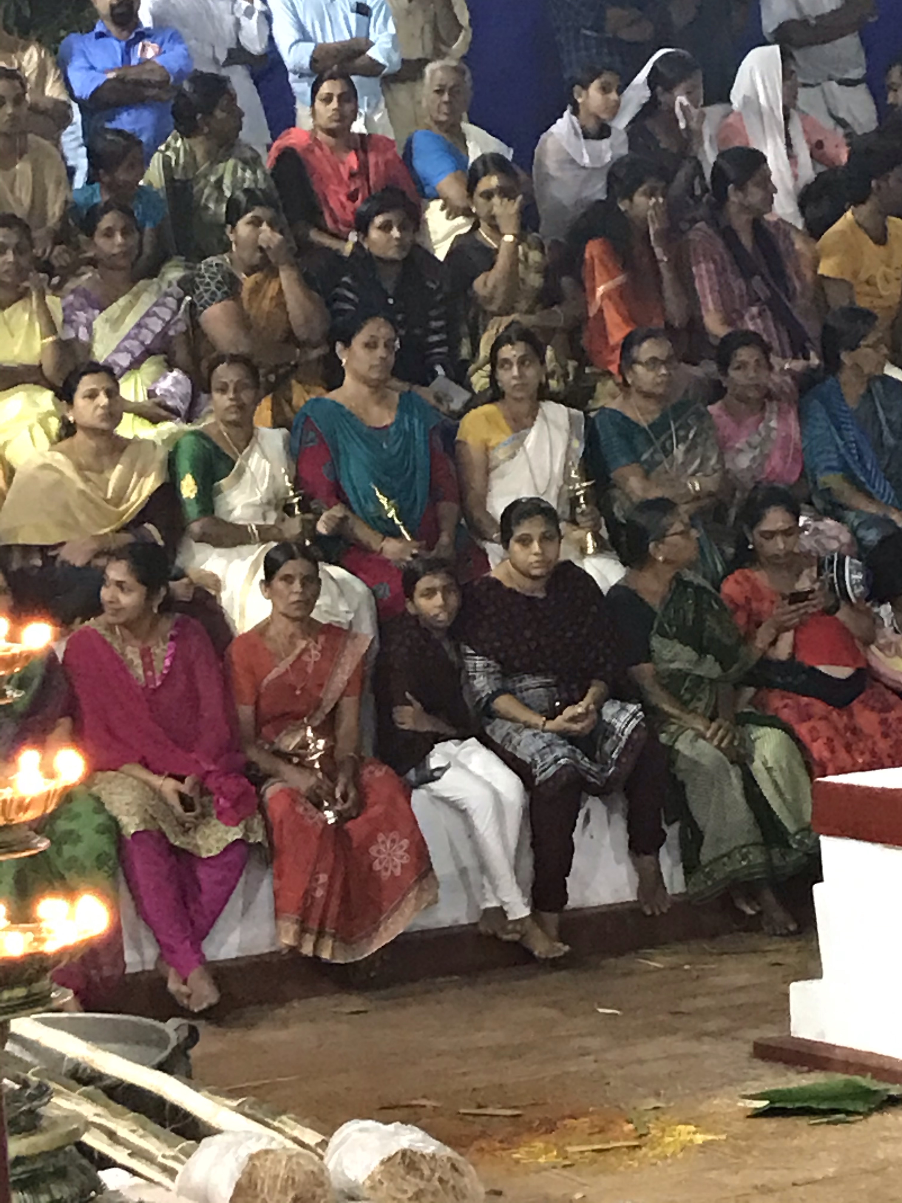 Beautiful traditional Keralan white silk saris banded with gold are worn by the older women, who have brass oil lamps which will be lit and blessed by the spectacular fire dancer deity who will be performing later.