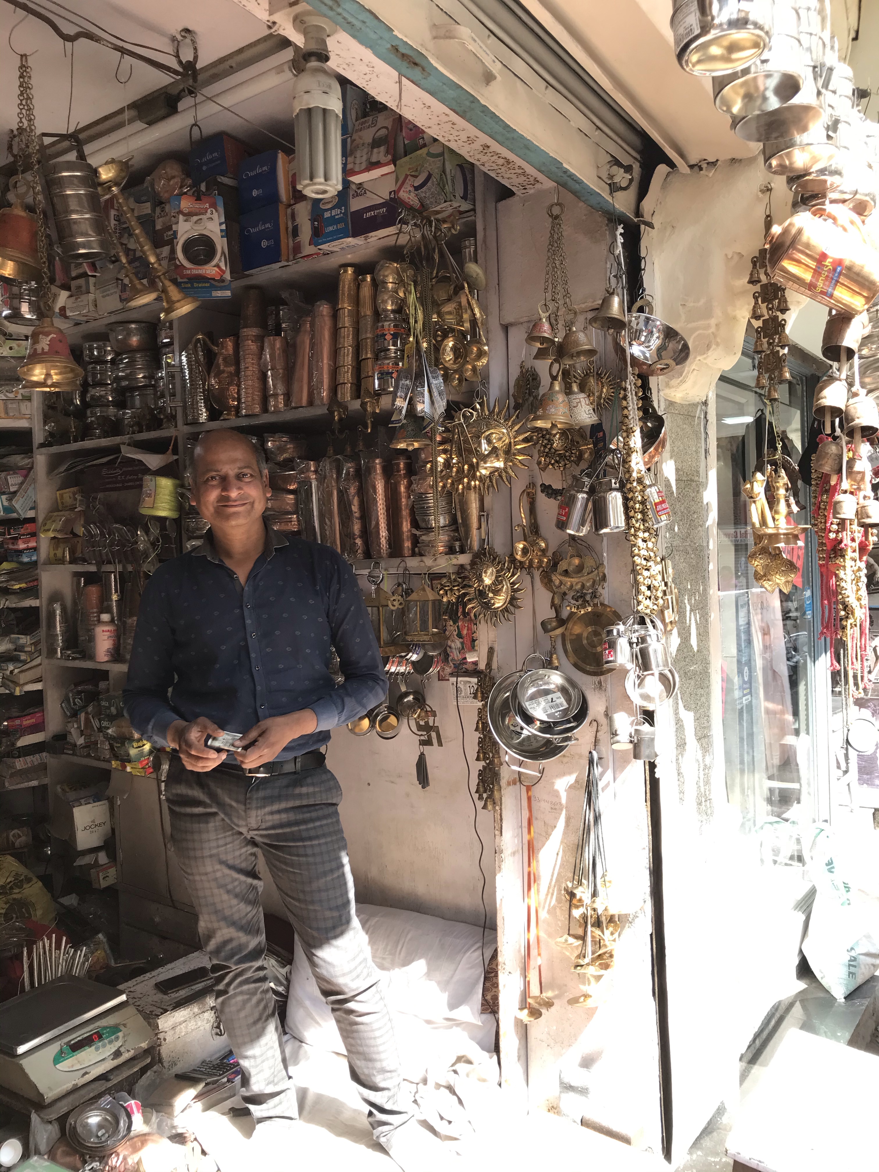 Shopkeepers are starting to open their stores. This one specializes in brass and copper kitchenwares. I bought several from him in years past.
