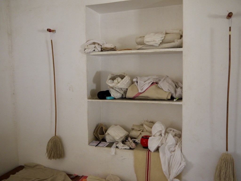 I was shown into the hostel where they were staying and the simple sleeping room consisted of a marble floor with stacks of blankets, several sweeper brooms with cotton tassels, and hand painted wooden eating bowls.