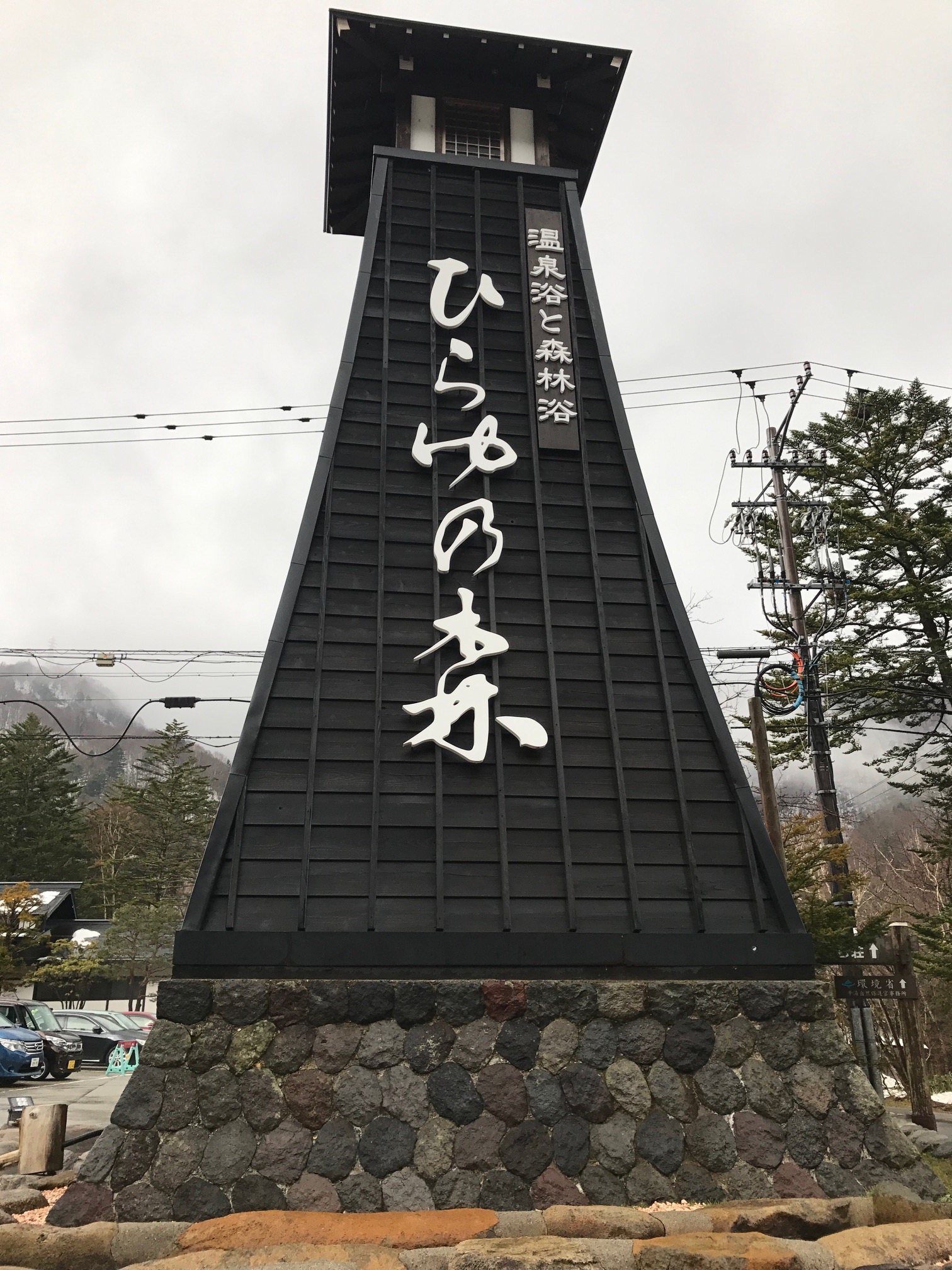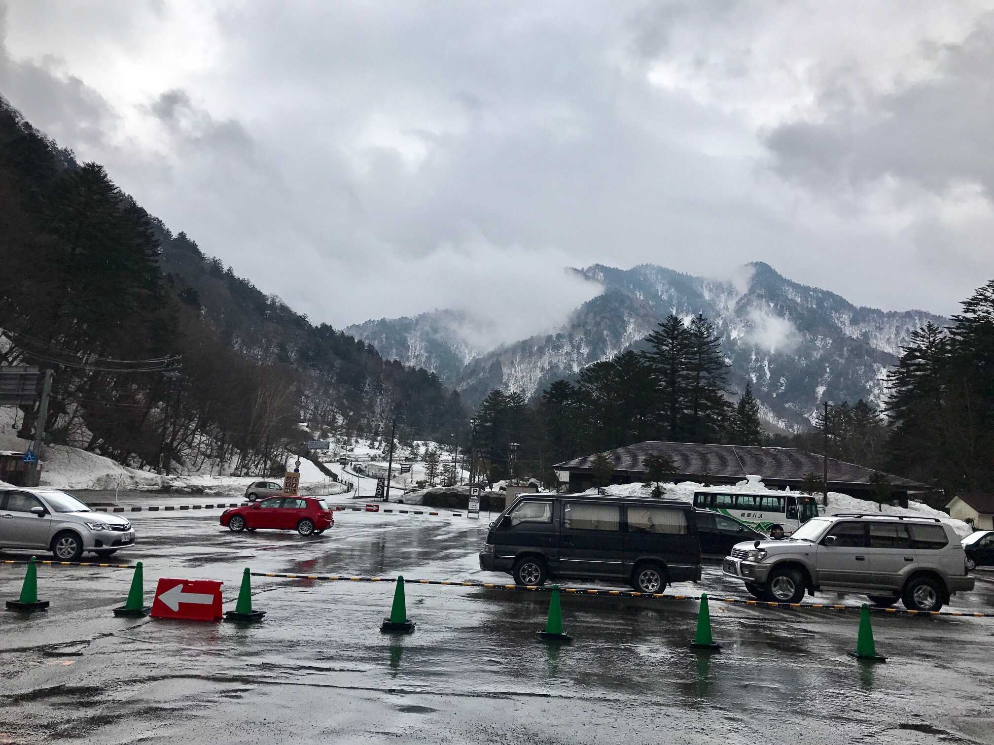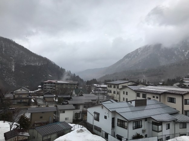 Once downstairs I try to make myself understood and get to the “real” onsen. Again I get puzzled looks until a young man takes pity on me and gets his girlfriend who speaks some English. There IS another one and it is in the Ryokan across the parking lot. At this point it is pouring and the piles of snow have melted into lakes which bar the path to my destination, but that will not deter me and I slosh through, soaking my sneakers and grabbing onto my bags under the flimsy cheap plastic raincoat I bought in Tokyo.