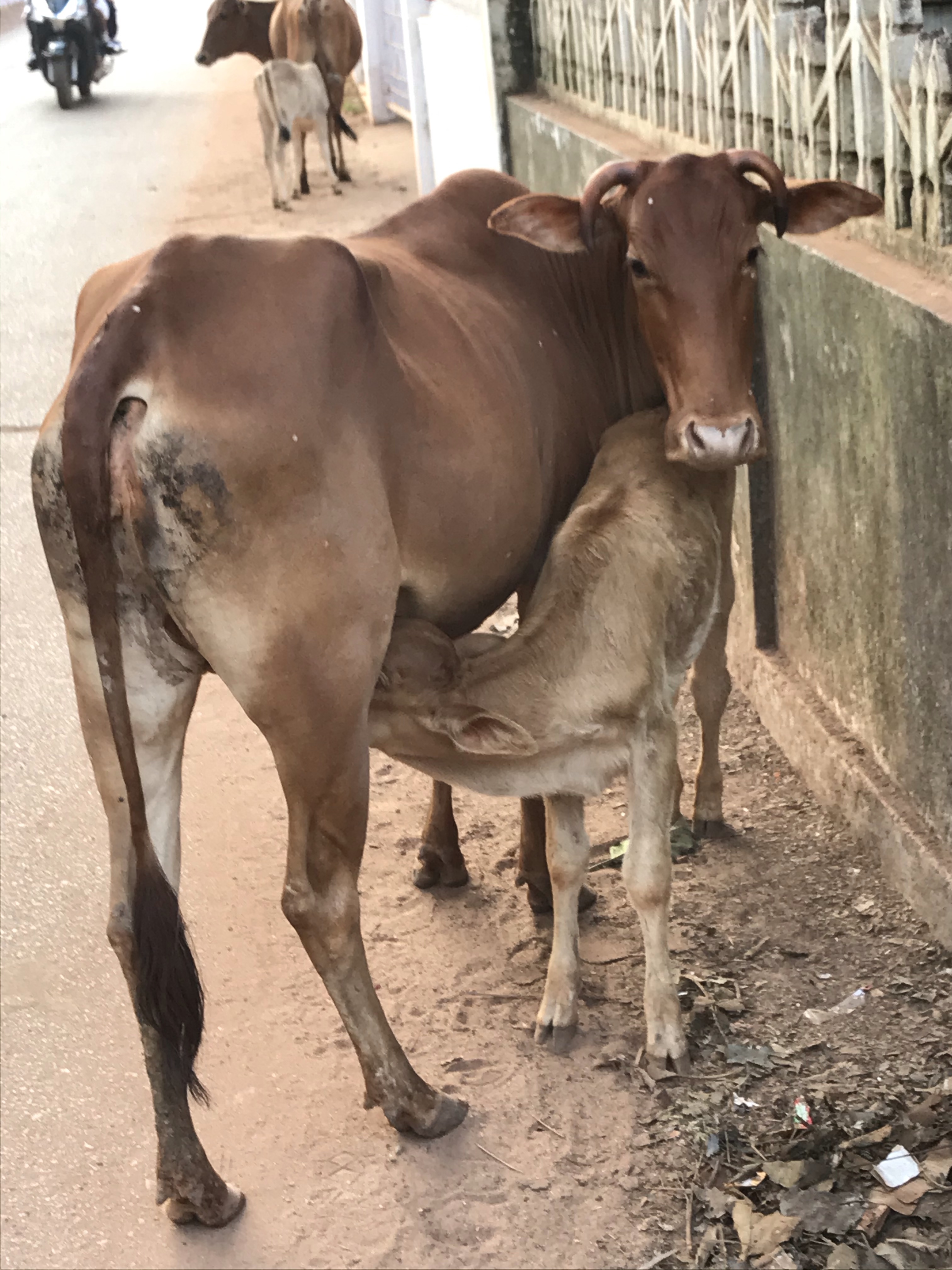 I love being out in the early morning before the sleepy village starts to come to life. Young girls with long black hair neatly braided in loops like pretzels,walk briskly in their freshly starched white uniforms, not wanting to be late for school and risk the ire of the schoolmaster. Motor scooters zip by while cows roam lazily in the middle of the road secure in the knowledge that no one will disturb them no matter how pesky they may be. ( Even in Catholic Goa cows are sacred).Today there are two cows busily nursing their calves.