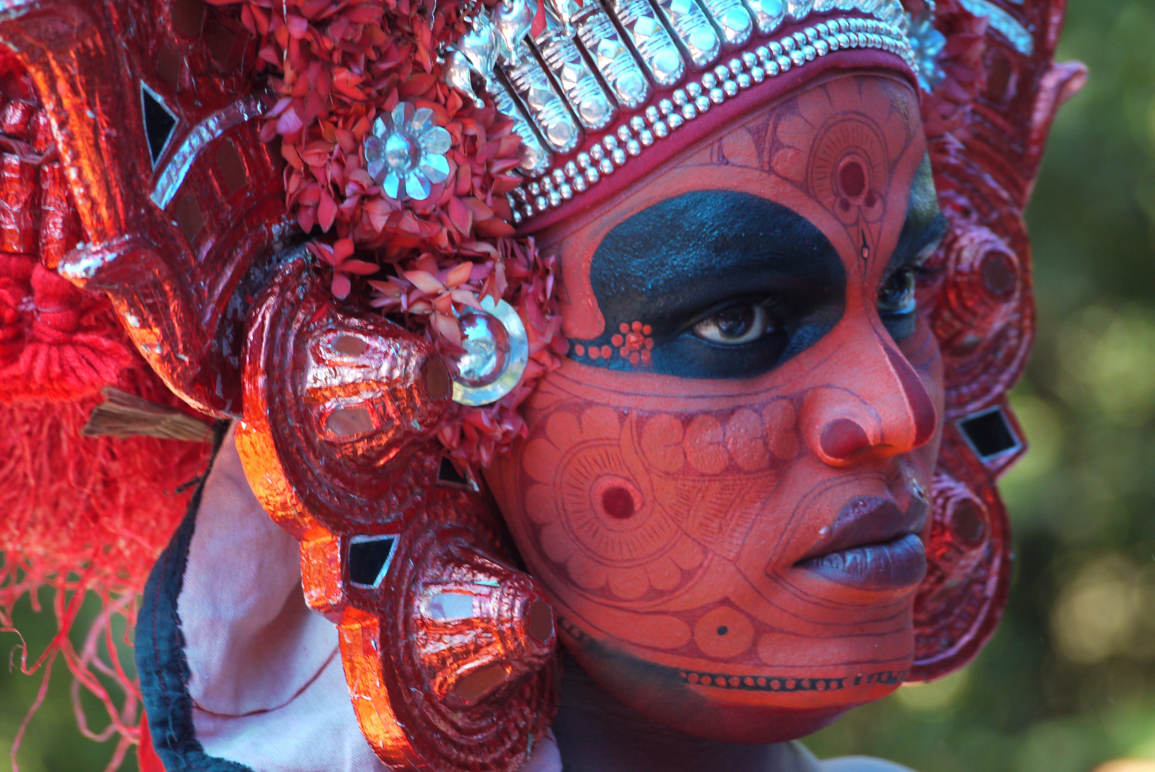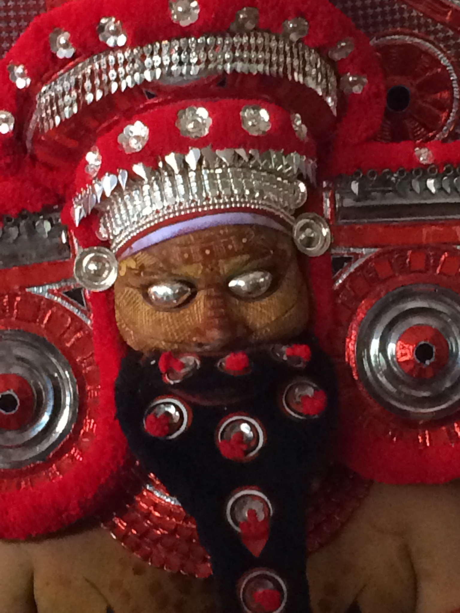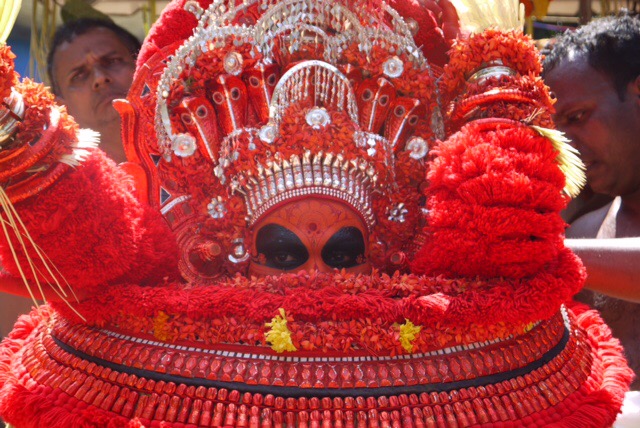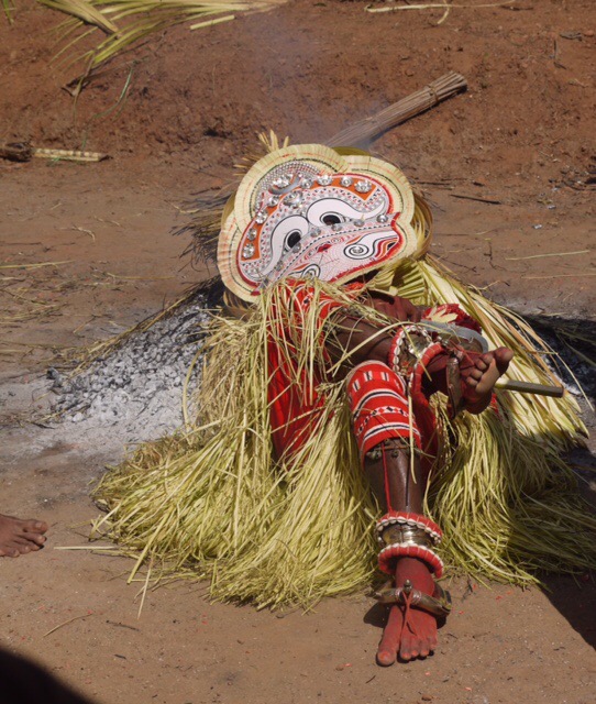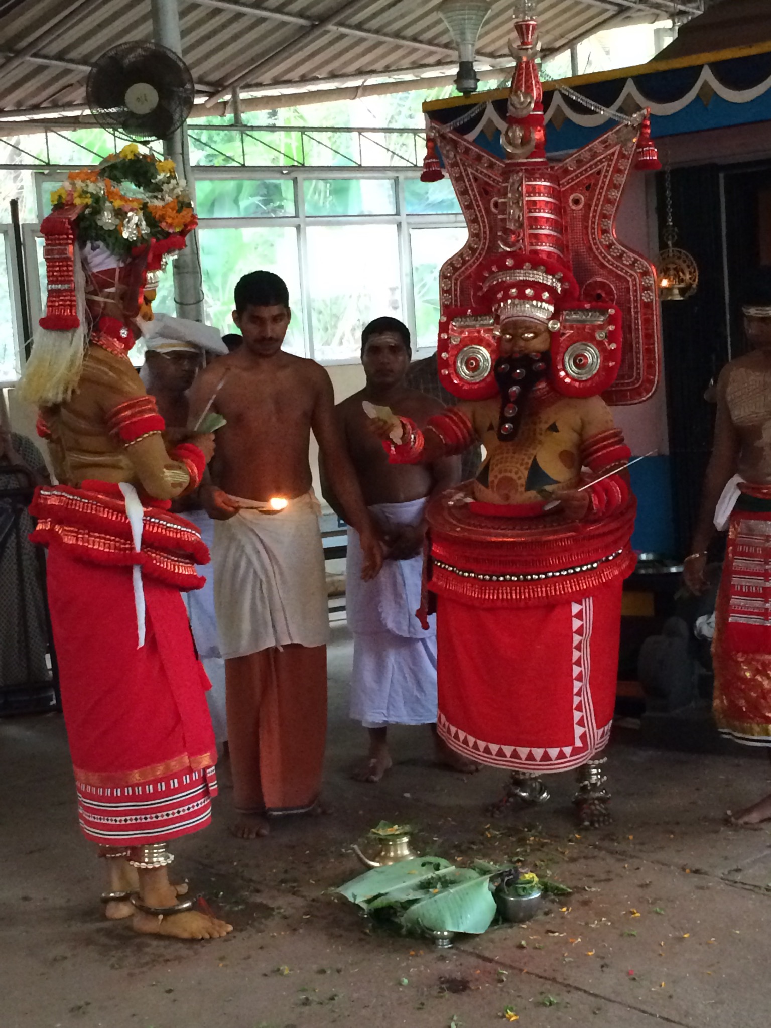 Each time Theyyam is performed, even if it is the same character, there is a sense of unpredictability. On this particular occasion it is both terrifying and playful. As the fiery Theyyam spins around, spreading balls of flames on the ground he is yelling angrily, running through the stands, stopping now and then to bless a man, woman or child. Then just as suddenly he leaps up to where a gaggle of young men are seated and grabs someone’s cell phone.